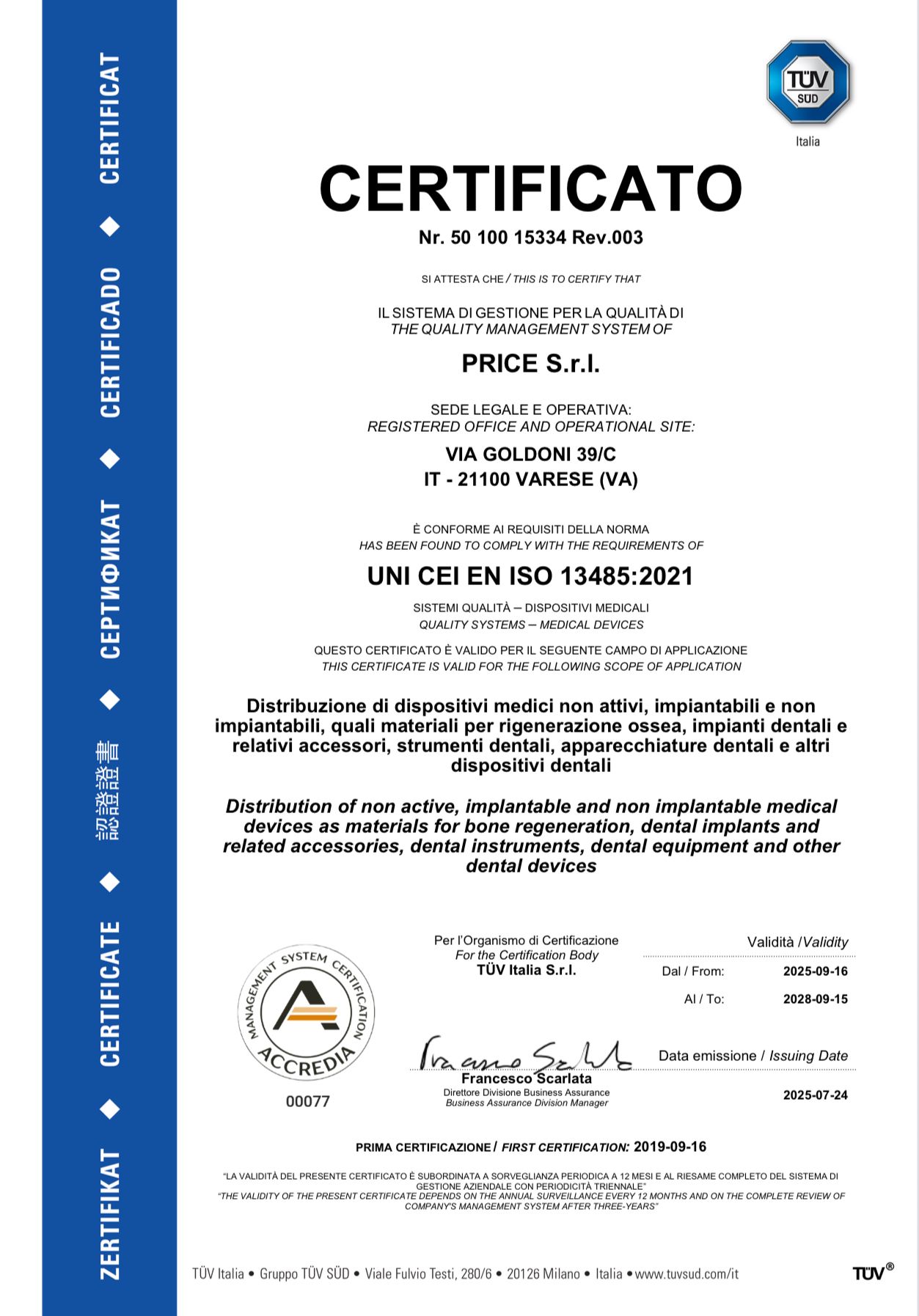 In 2019 PRICE obtained the cerification according to ISO 13485:2016 (received by TÜV Italia s.r.l.)